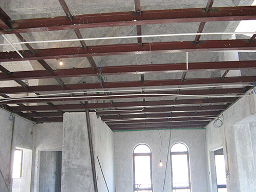 2.解決了槽鋼的固定點(diǎn),下面要解決的就是主龍骨的編排。一般對(duì)于居室來(lái)說(shuō),建議采用120×60×6mm或以上規(guī)格的槽鋼作用主龍骨。主龍骨應(yīng)該與短的一邊平行進(jìn)行鋪設(shè),間隔500mm左右。